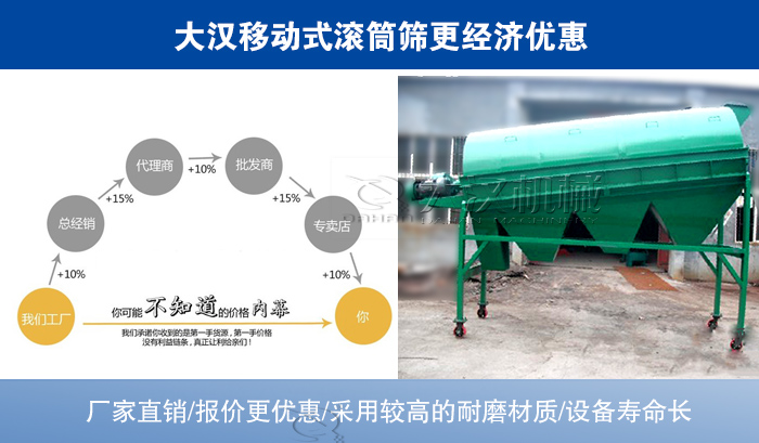 2、廠家采用薄利多銷經營理念,單臺移動式滾筒篩利潤更低,因此設備報價更優惠;