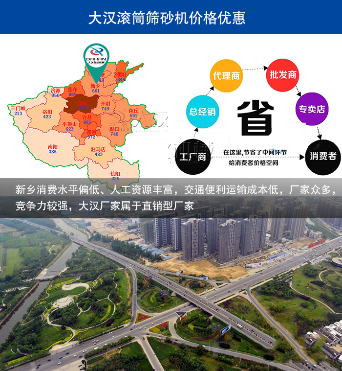 3、新鄉(xiāng)地區(qū)消費水平偏低,針對購買用戶群體多為周邊城市,從消費者出發(fā),我們廠家制定價格一般偏低,另外大漢廠家屬于直銷型廠家,無中間商,滾筒篩沙機價格更便宜;