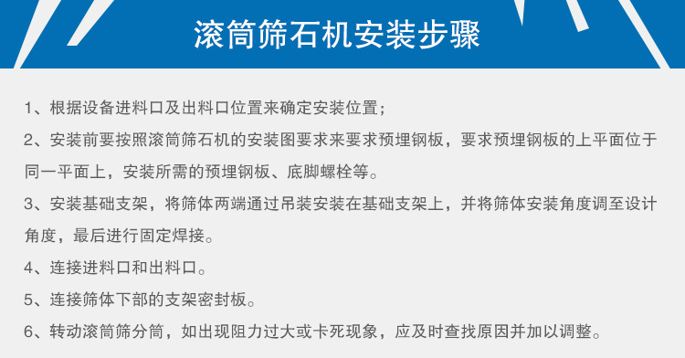 2、安裝前要按照滾筒篩石機的安裝圖要求來要求預(yù)埋鋼板,要求預(yù)埋鋼板的上平面位于同一平面上,安裝所需的預(yù)埋鋼板、底腳螺栓等。