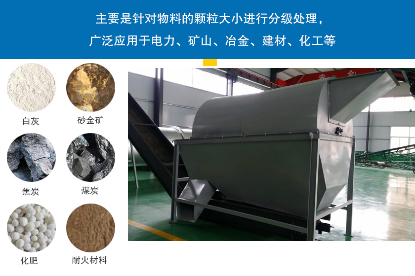大型滾筒篩主要是針對(duì)物料的顆粒大小進(jìn)行分級(jí)處理,廣泛應(yīng)用于電力、礦山、冶金、建材、化工等行業(yè),常用于耐火材料、煤炭、化肥、砂場(chǎng)石塊的分級(jí),還可以處理焦炭、白灰、砂金礦等粘濕性物料。