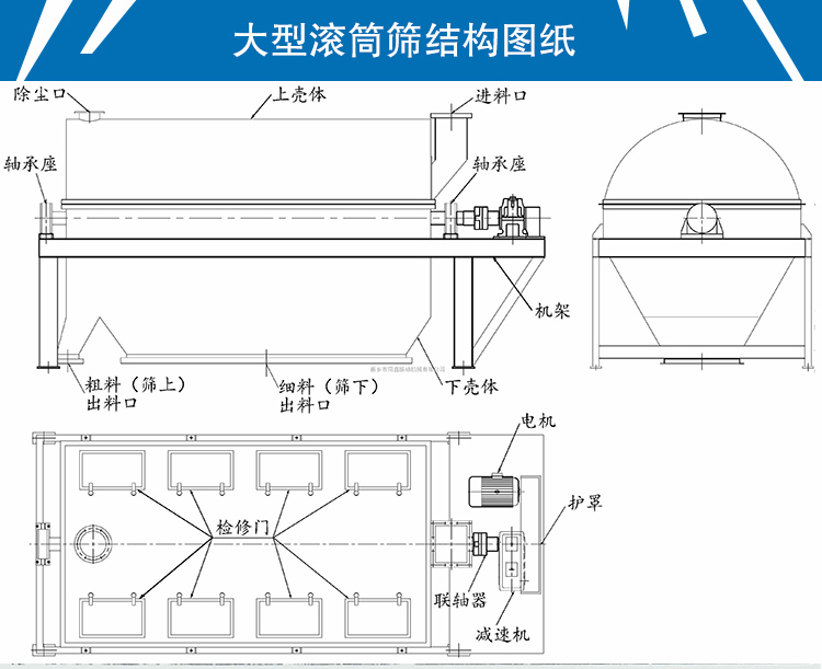 大型滾筒篩主要有電機(jī)、減速機(jī)、滾筒裝置、機(jī)架、密封蓋、進(jìn)出料口組成。滾筒裝置傾斜安裝于機(jī)架上。電動(dòng)機(jī)經(jīng)減速機(jī)與滾筒裝置通過聯(lián)軸器連接在一起,驅(qū)動(dòng)滾筒裝置繞其軸線轉(zhuǎn)動(dòng)。