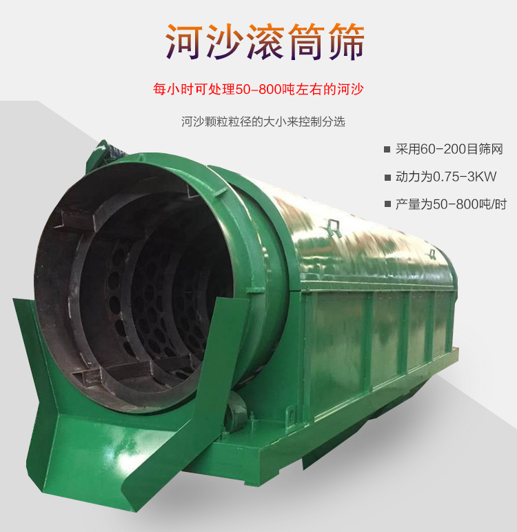 河沙滾筒篩是專門用來對(duì)河道中河沙進(jìn)行分選的設(shè)備,是通過河沙顆粒粒徑的大小來控制分選的,采用60-200目篩網(wǎng),動(dòng)力為0.75-3KW,產(chǎn)量為50-800噸/時(shí),根據(jù)不同用戶的實(shí)際情況定制各種規(guī)格。