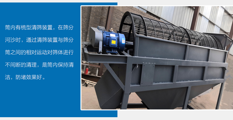 2、筒內(nèi)有梳型清篩裝置,在篩分河沙時(shí),通過清篩裝置與篩分筒之間的相對(duì)運(yùn)動(dòng)對(duì)篩體進(jìn)行不間斷的清理,是筒內(nèi)保持清潔,防堵效果好。