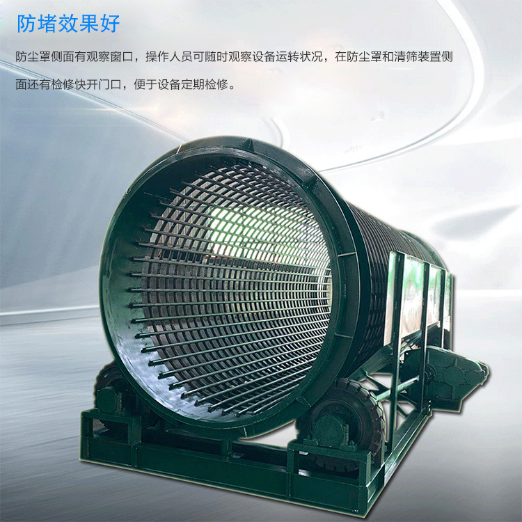 5、防塵罩側(cè)面有觀察窗口,操作人員可隨時(shí)觀察設(shè)備運(yùn)轉(zhuǎn)狀況,在防塵罩和清篩裝置側(cè)面還有檢修快開門口,便于設(shè)備定期檢修。