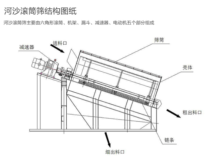 河沙滾筒篩主要由六角形滾筒、機(jī)架、漏斗、減速器、電動(dòng)機(jī)五個(gè)部分組成的。