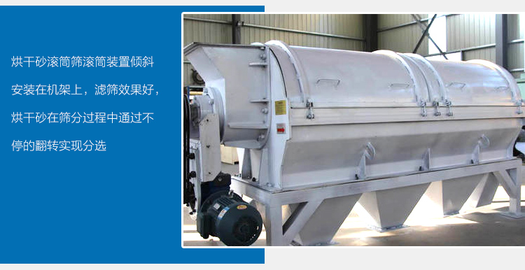 烘干砂滾筒篩是專門針對用于對烘干沙進行分選的一種設備,一般用在大中型采石場使用。烘干砂滾筒篩滾筒裝置傾斜安裝在機架上,濾篩效果好,烘干砂在篩分過程中通過不停的翻轉實現分選,不易堵塞,篩下產品為200mm,中間20-40mm,細至5mm以下,筒內安裝有梳型清篩裝置,可以對筒內進行清潔作用,可防止物料堵塞。